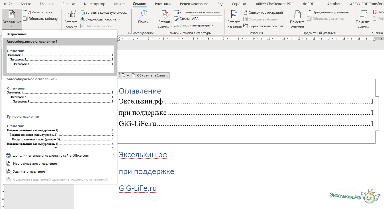 - Чтобы оглавление создалось само, используйте Стили (Заголовок 1, Заголовок 2) для названий разделов. Затем перейдите во вкладку Ссылки, нажмите кнопку Оглавление и выберите «Автособираемое оглавление». Оно само подтянет названия глав и номера страниц.